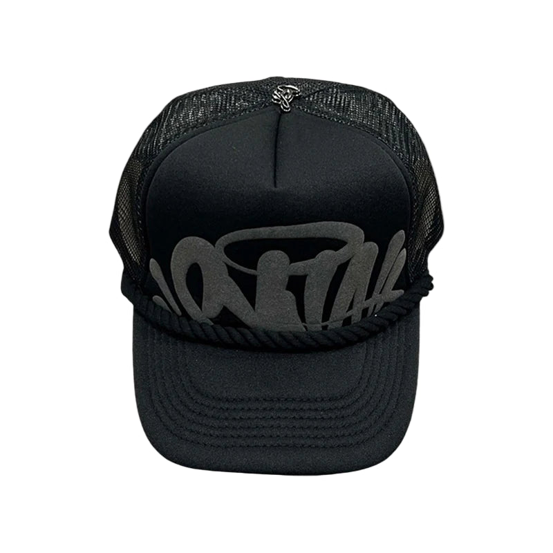 The Syna World Rope Trucker Hat – Black is a must-have accessory for anyone locked into the UK streetwear wave. Featuring a classic trucker silhouette with breathable mesh panels, it’s finished with a bold rope detail across the brim and the signature Syna World logo embroidery up front.